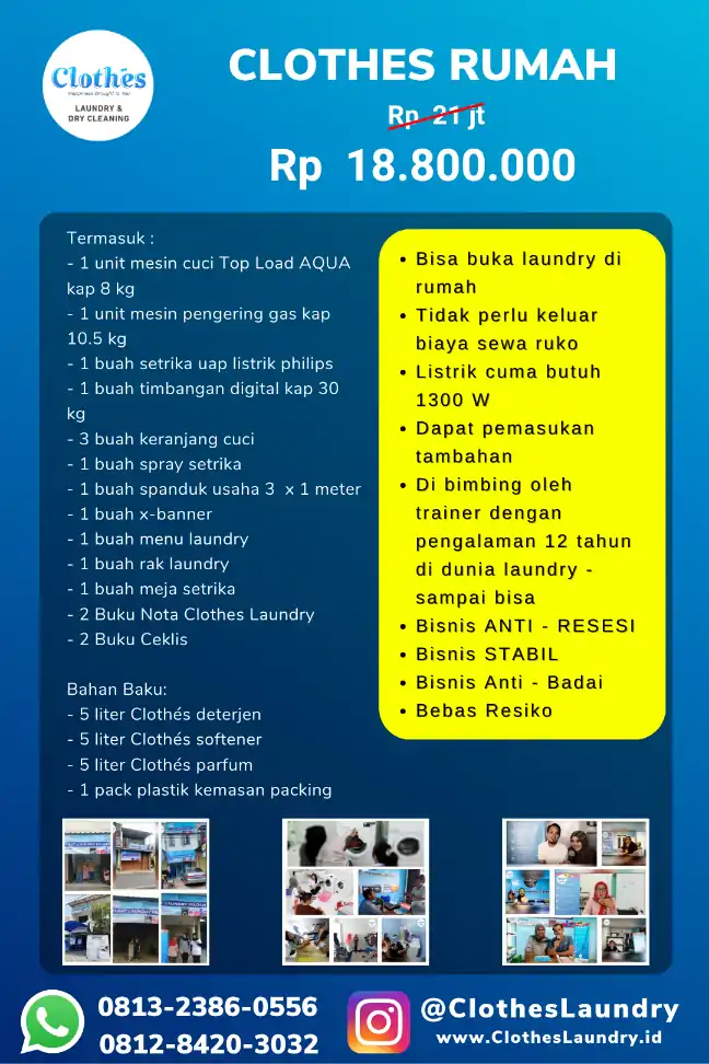 Secara umum, Clothes Laundry menyediakan paket lengkap memulai usaha laundry, berikut juga dengan pelatihan laundry nya, langsung di lokasi usaha Mitra Usaha.